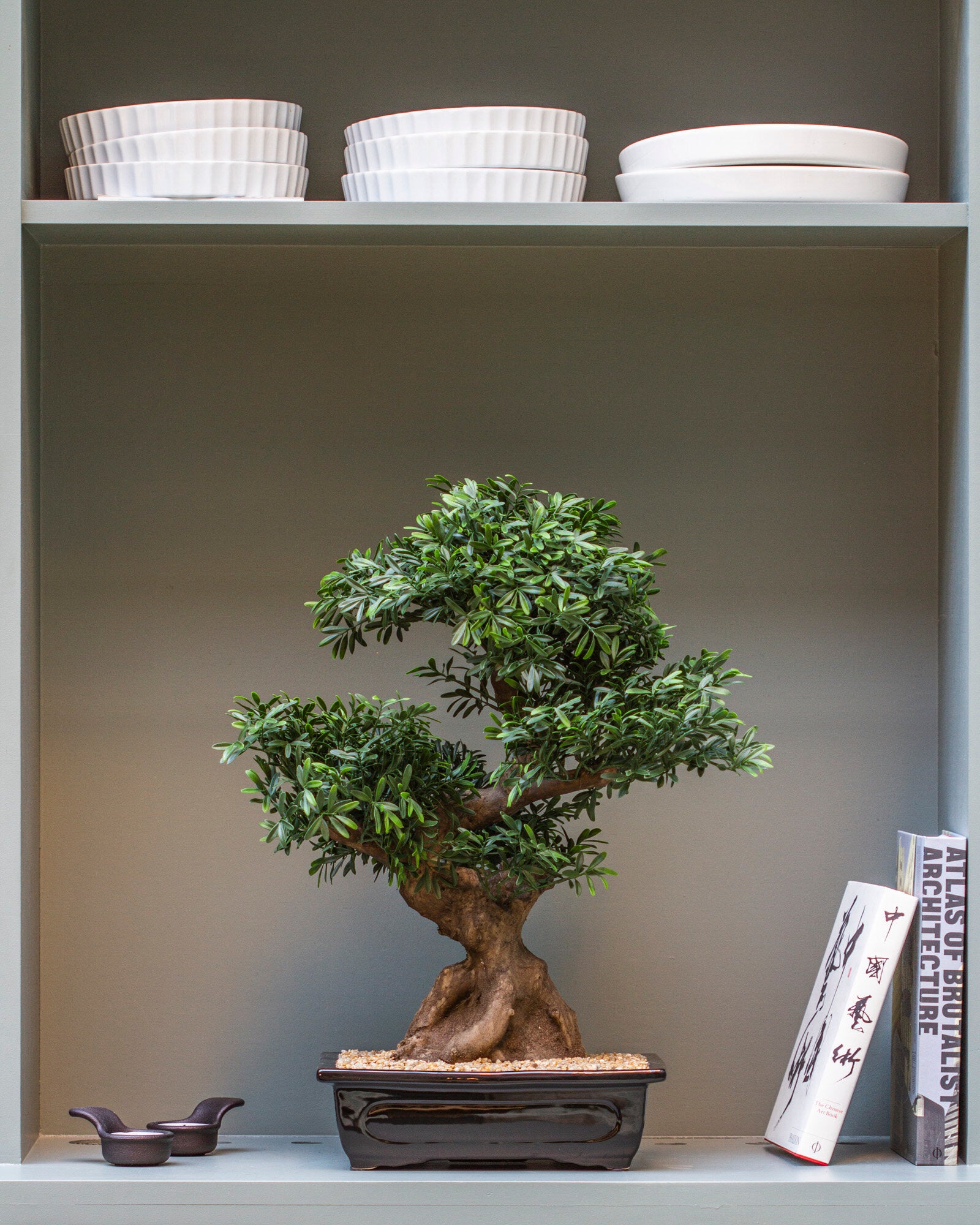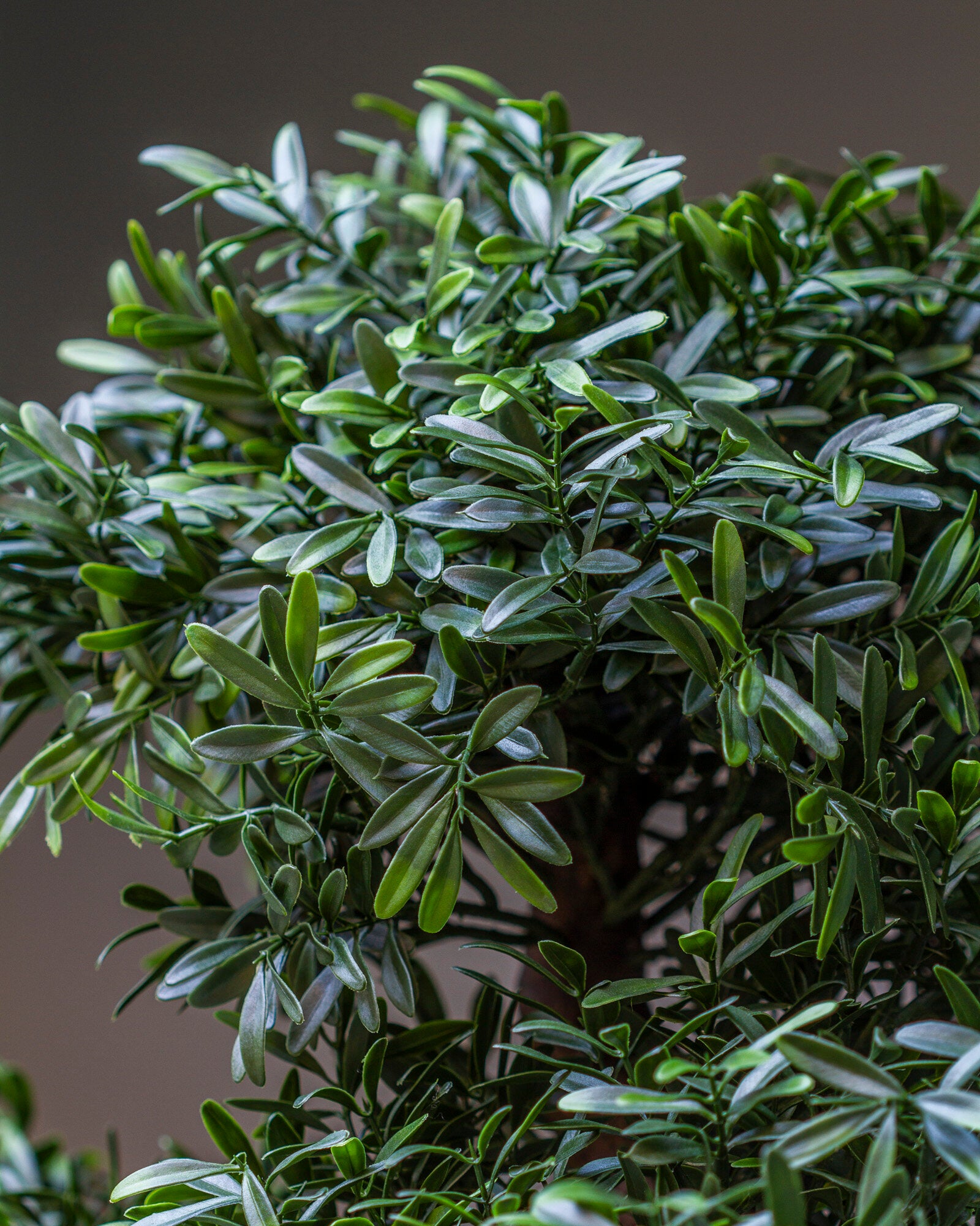 Bonsaiträd 70 cm. Dess välgjorda stam och täta mörka blad får det att se mycket verklighetstroget ut.